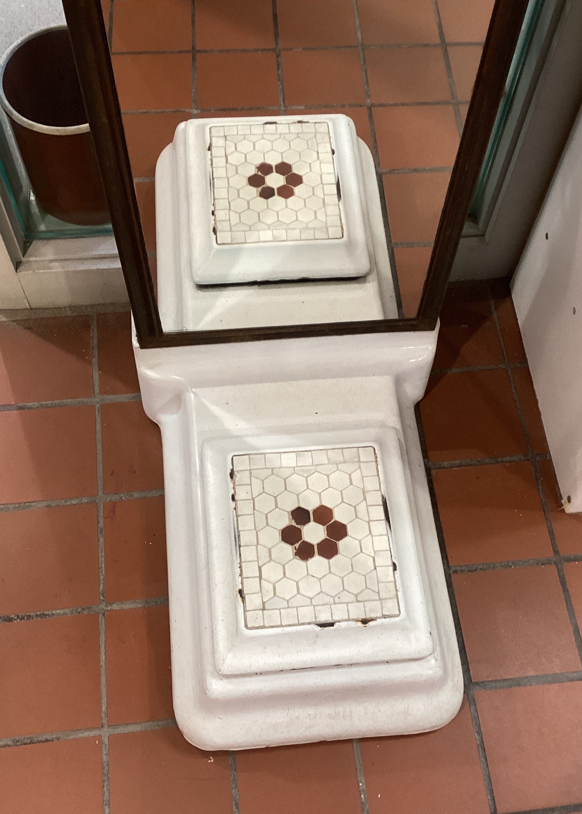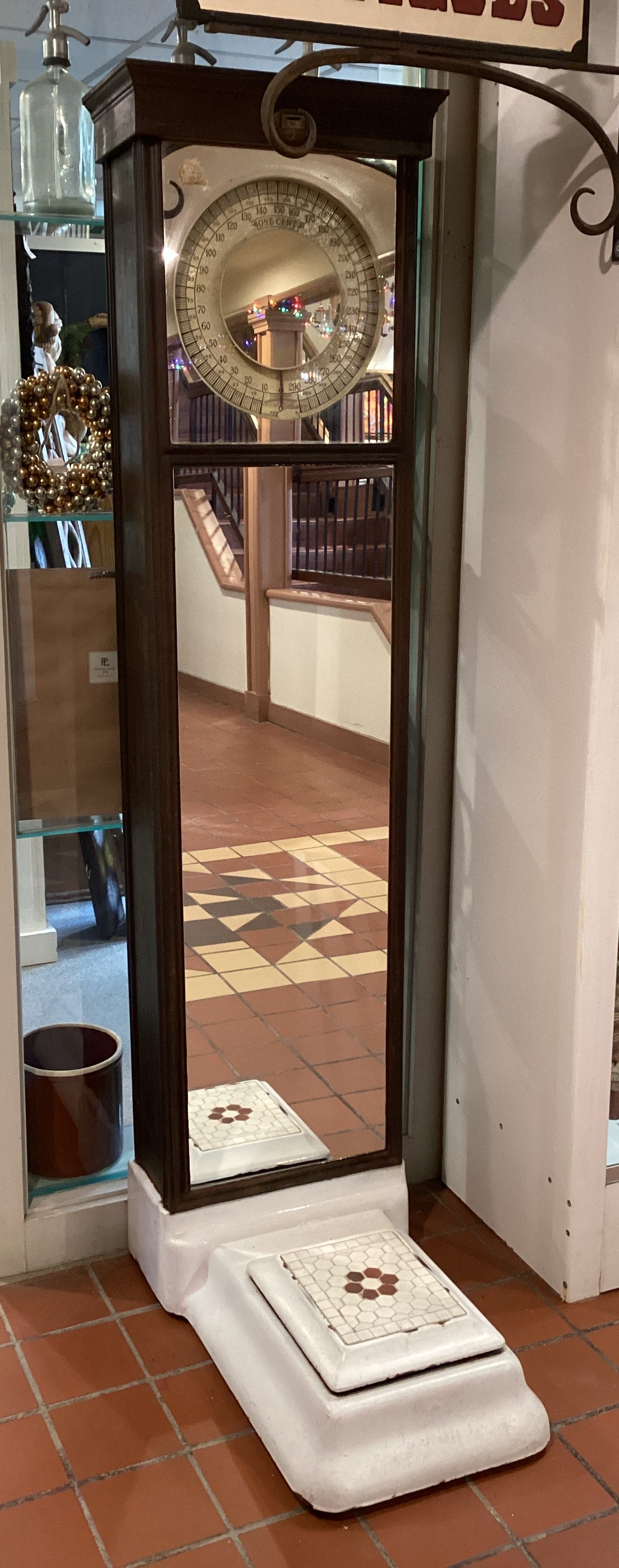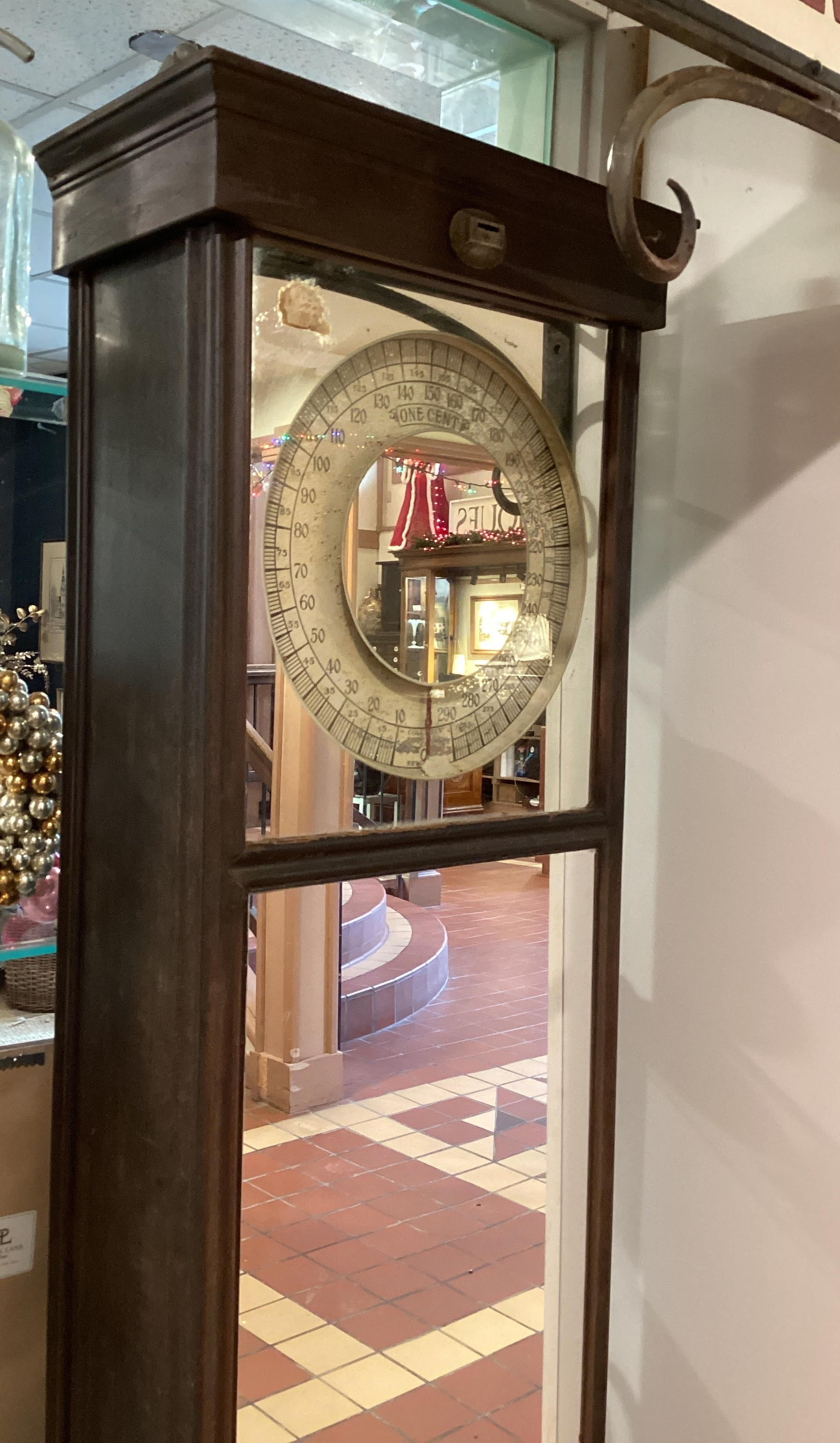 1920s Arcade Penny Scale. In working condition, as found. Missing back cover and coin catch can. 71" tall.