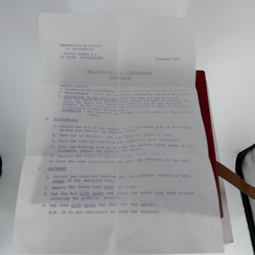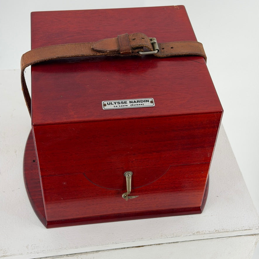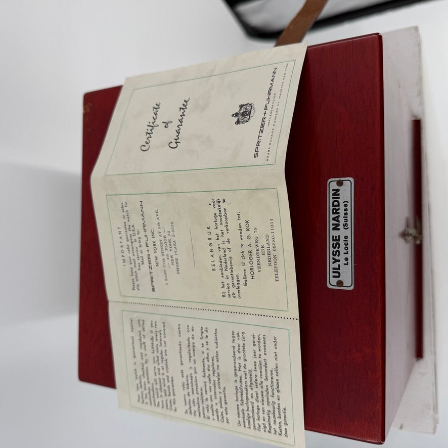 Swiss made by Ulysse Nardin 1960s. Complete with storage / transport case, Instructions warranties and manufacturer's papers. Beautiful condition, with some minor marring to outer case corner, and age related wear to leather noted.