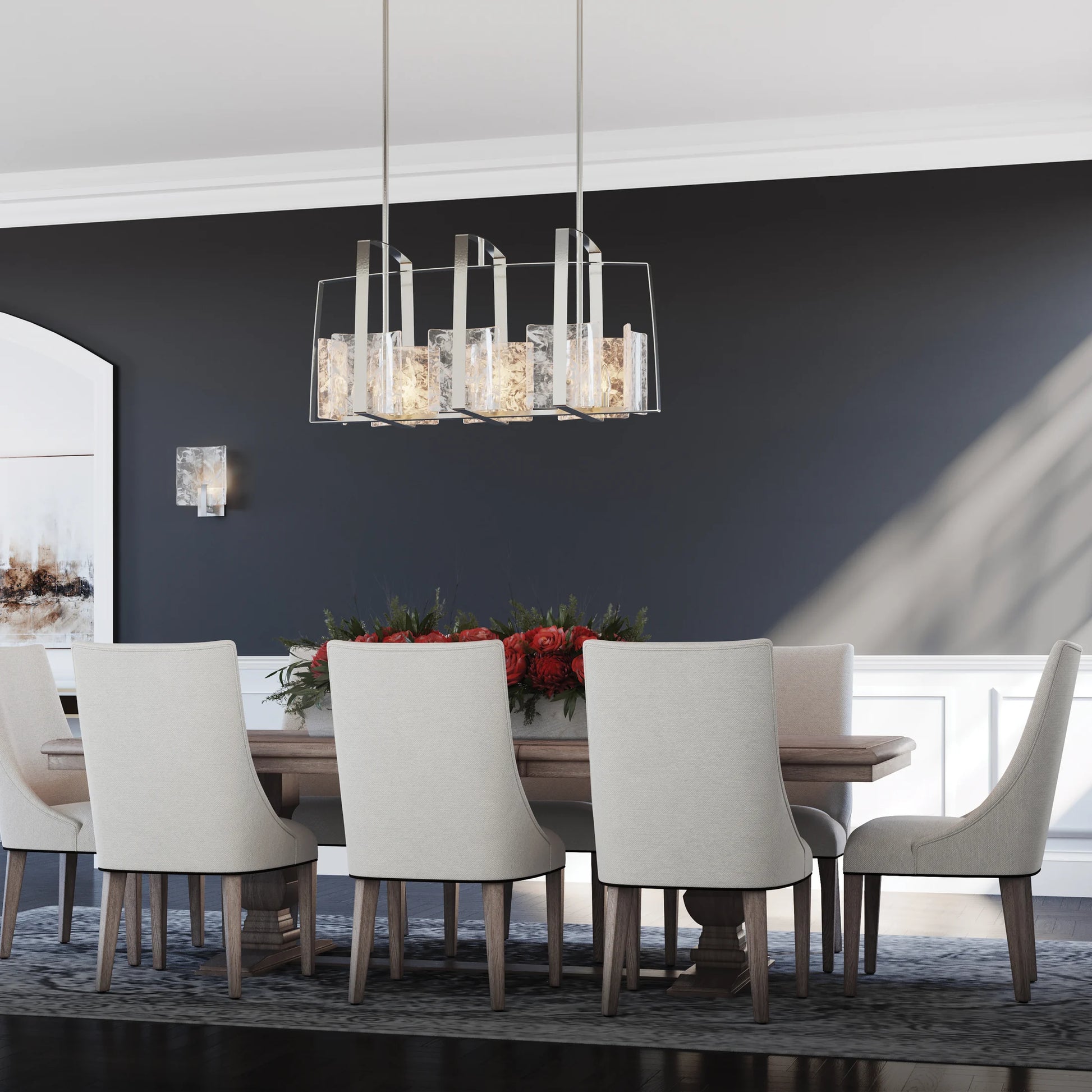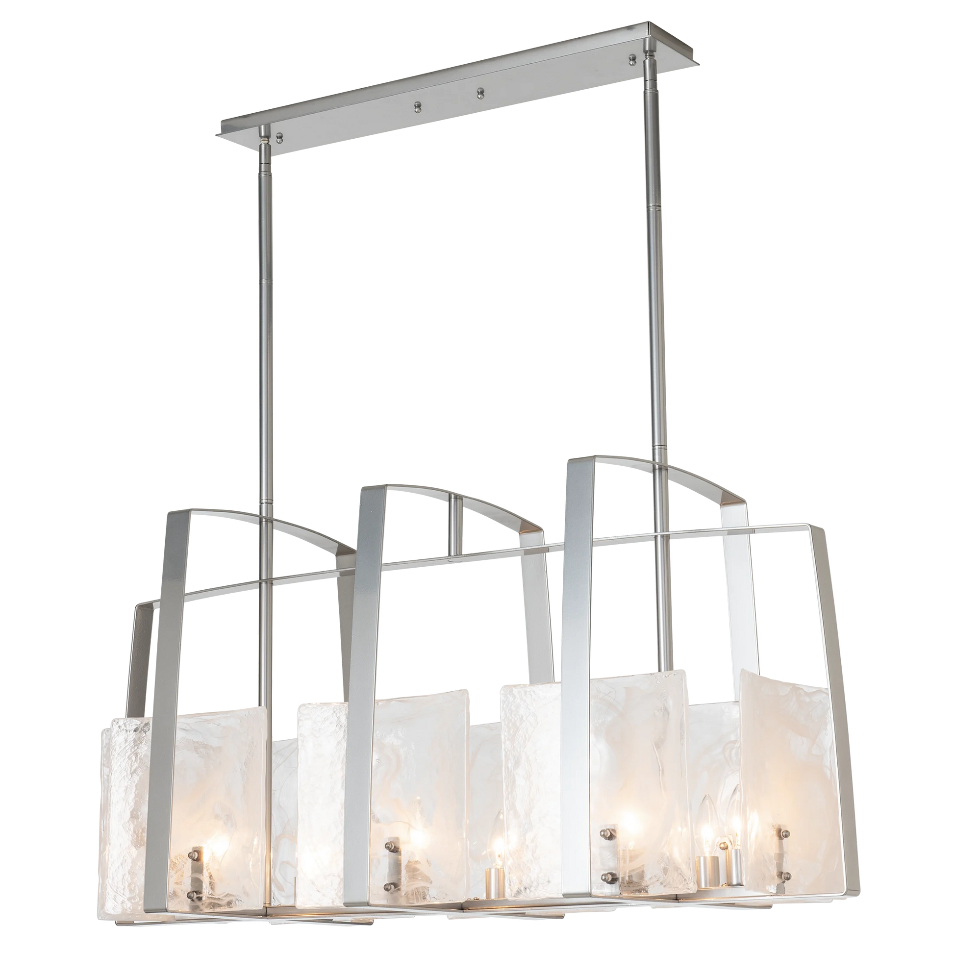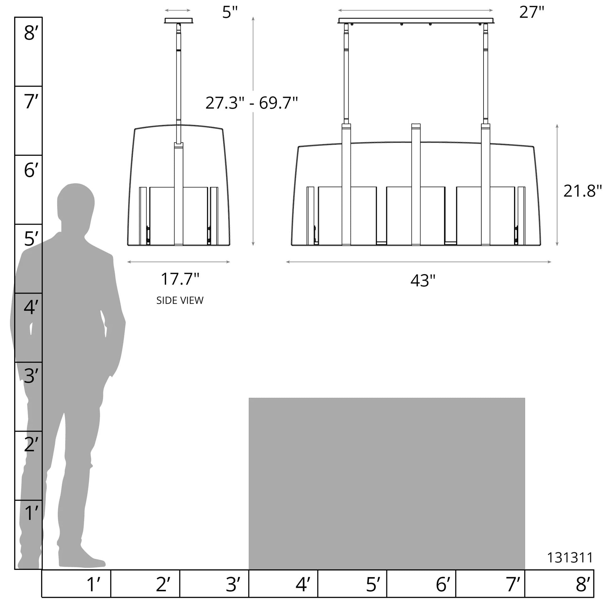 This chandelier is brand new with just a few minute blemishes from display. Currently retails for $4100 from Hubbarton Forge. Extremely high quality, very heavy. Adjustable in height in installation 27-70". ~44x18x22 IN.