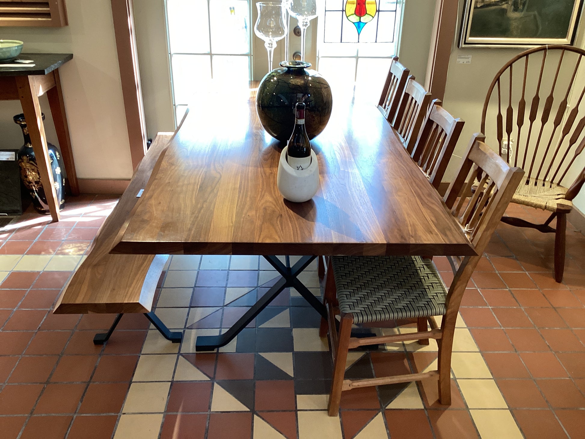 "Naturale" table and bench with a solid Walnut top and steel frame. Custom ordered in 2023 at a price of $7500 Original manufacturer's label can be seen on the underside. Excellent condition, very heavy!