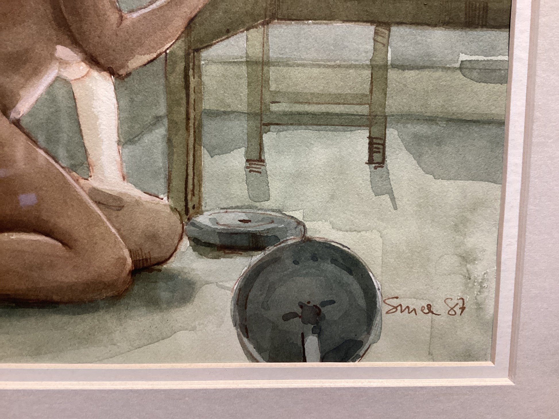 Michael Smee (british 1946-). Watercolor depeicting a model conversing with a cat. Image size 12x9 IN. Framed size 19x16 IN.