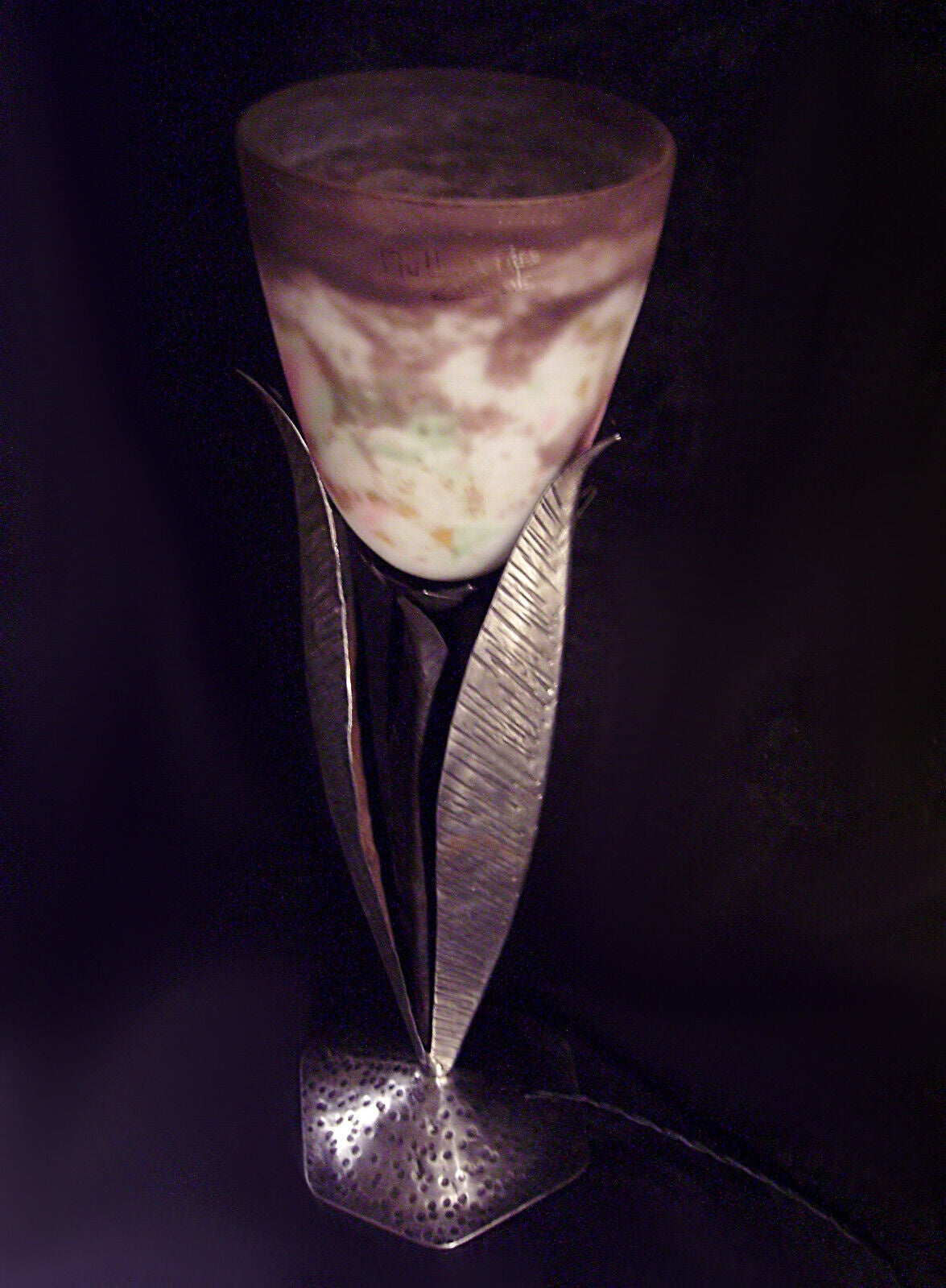 Rare art deco lamp, "iris", hammered wrought iron and tulip in glass paste signed Muller Frères Lunéville by the Jean Born and Cie Establishments better known as Robj. Originally offered in three sizes in the 1920s, this is the medium size. In excellent antique condition, recently rewired it retains it's french style socket and comes with an LED bulb. Can be seen in the period catalog of "Au Régent" in Toulon, France. 58 cm tall.