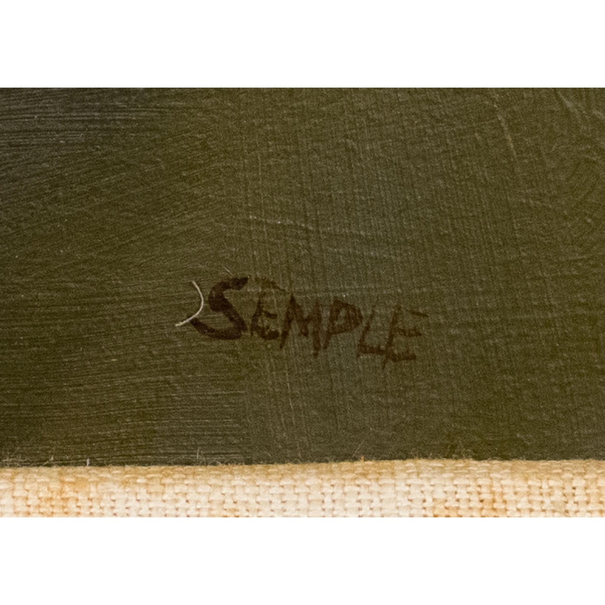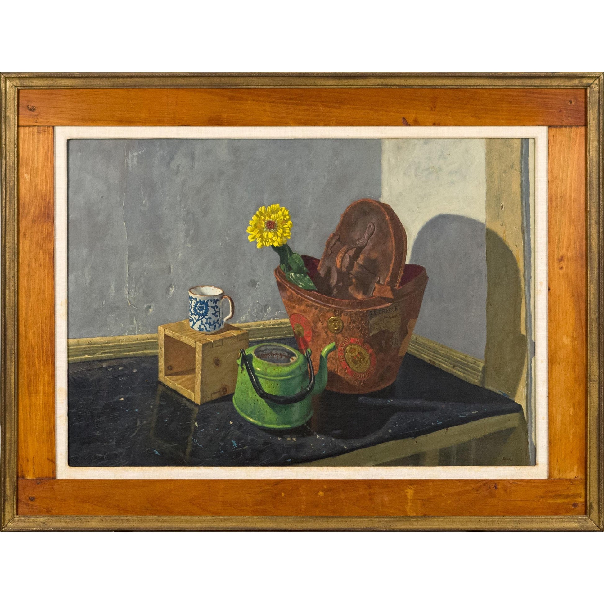 John Paulus Semple (American 1930 - 2015) A vintage 1980s oil on board,interior still life with hat box, artist signed lower right, Semple. Image 21.5”H x 30”W, Overall in frame 28.5”H x 37.25”W
