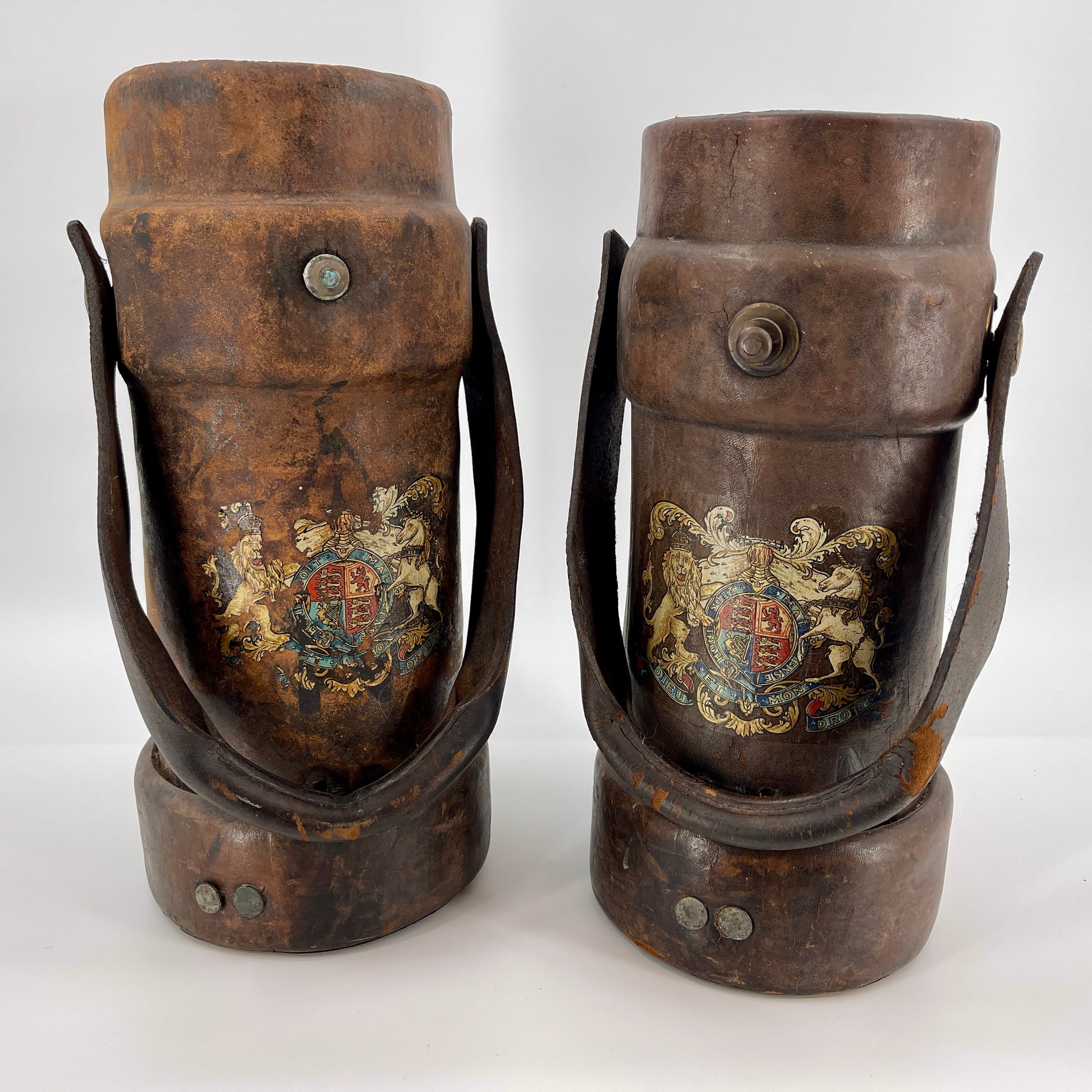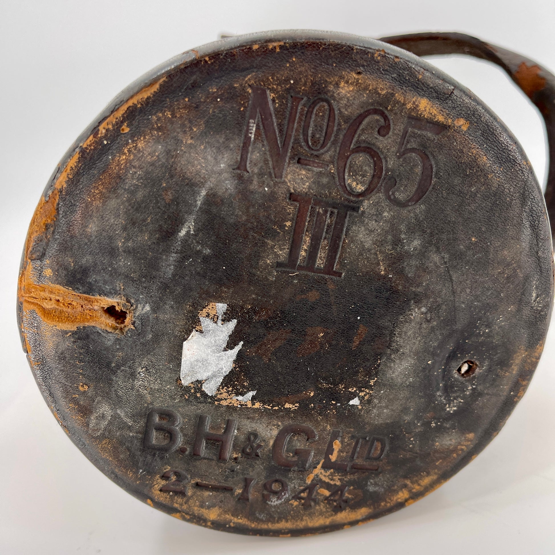 Bucket / Containers originally used for transport and storage of cordite explosive in WWII. Brown leather with British coat of arms. Underside is stamped "No 65 III" and "B.H. & G. Ltd 2-1944"