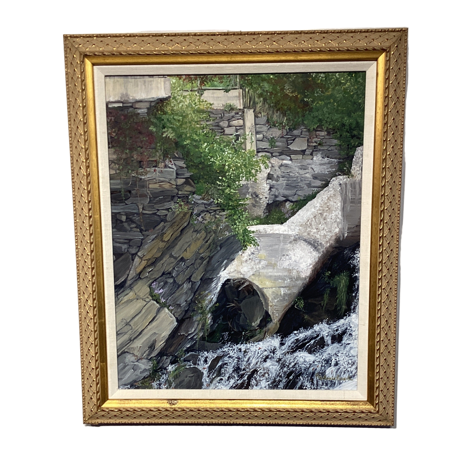 Depicting old sluiceway at Parker's Mill in Quechee VT 15"x20" canvas. 20X24 framed
