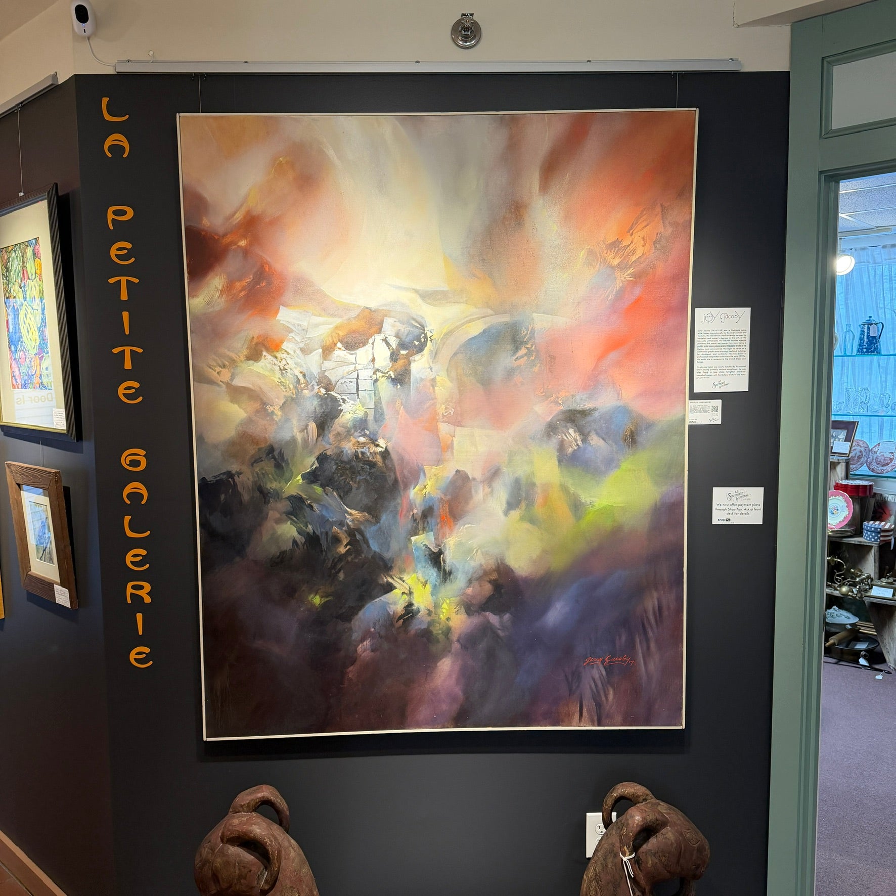 Jerry Jacoby (1938-2018) Abstract work. This piece was appraised in 2005 at $4,200.00. Oil on panel with simple wood frame 60" x 48". Excellent condition, but would be improved with a light clean. Provenance: Purchased from Haymarket Gallery in Lincoln, NE in 1973